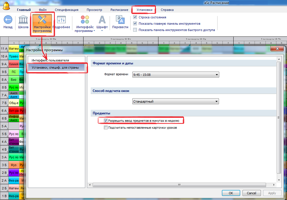 Если в Вашем учебном заведении есть периоды (уроки) различной продолжительности, Вы можете пойти в меню "Установки / Настройки программы". Затем выберите "Установки, специфические для страны" и "Разрешить ввод предметов в минутах в неделю.