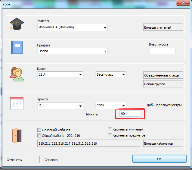 Примечание: Вы все равно должны указать число уроков в неделю. Так, если математика для 6A должна быть 150 минут в неделю и вы укажете 3 урока в неделю, программа может поделить так: 60+40+50 или 50+50+50.