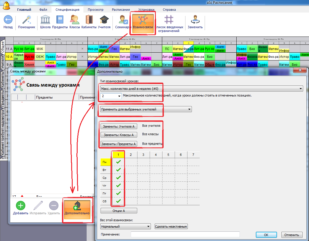 Вы должны установить для всех учителей "Ограничить количество дней, когда уроки могут стоять в отмеченных позициях", например "2", см.: