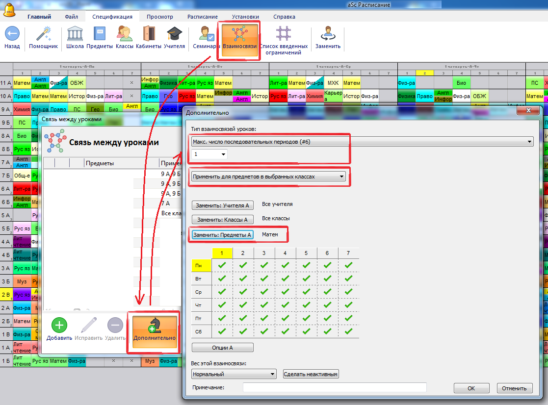 Если есть 6 уроков по математике у классов при пятидневной неделе, то тогда обязательно получится два урока по математике в один день. Если они не могут идти друг за другом, Вам нужно добавить такую взаимосвязь: