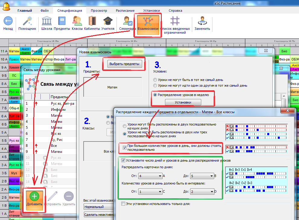 Установки, помечены зеленым цветом, не является обязательными/ Если, например, у Вас есть 6 уроков математики, программа будет по умолчанию ставить их в 5 дней (один день будет иметь два урока по математике).