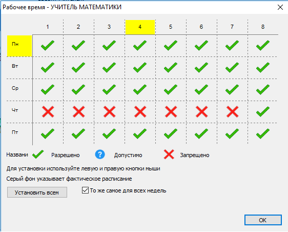 Учитель может иметь уроки всю неделю, за исключением четверга. Но почему-то он может иметь и 8-ой урок в четверг. В большинстве реальных ситуациях это не то, что пользователь хотел ввести, поэтому программа выдаст предупреждение. Вы можете скрыть его, если он действительно может иметь этот один урок в четверг.