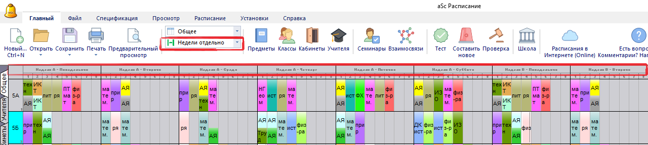 Примечание: если есть некоторые уроки, которые находятся на разных позициях каждый день, например, все уроки находятся в те же периоды каждый день, и только один различний урок есть по вторникам, программа покажет два урока в соответствующей колонке.