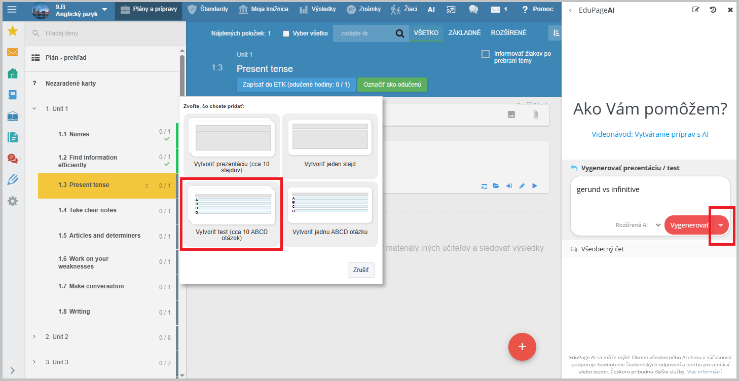 EduPage AI vytvorí 10 testových otázok.