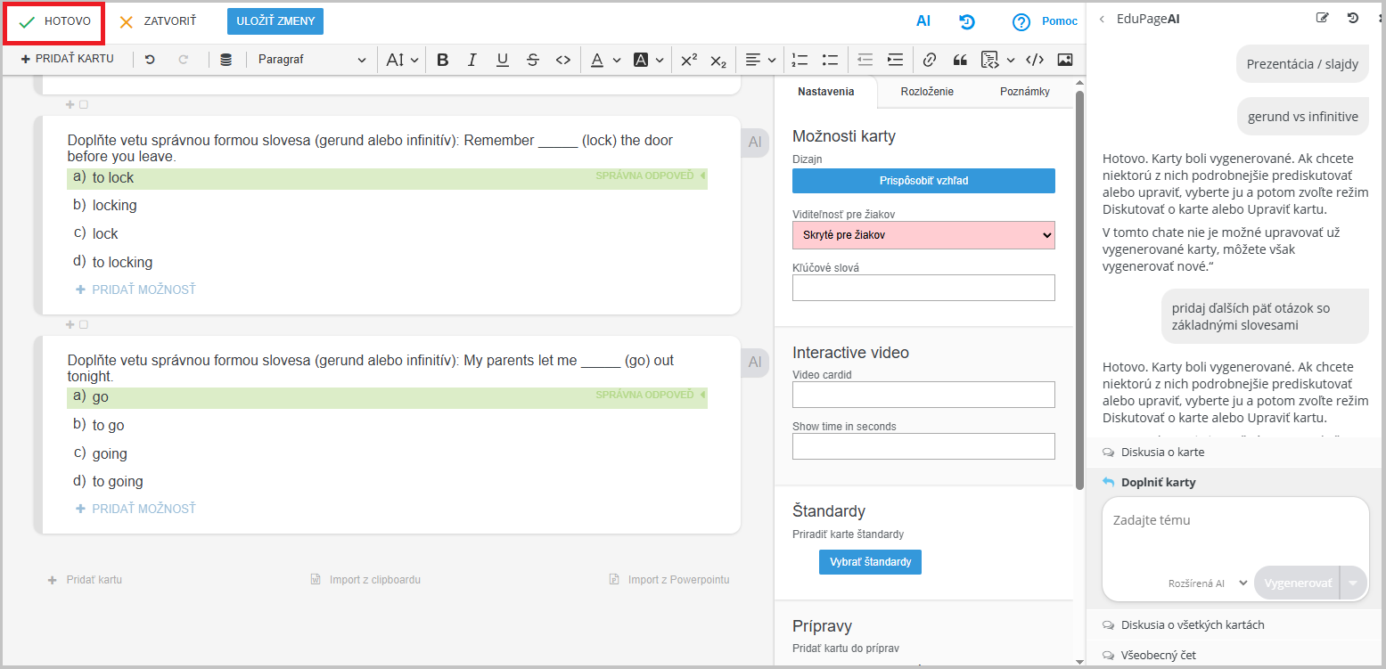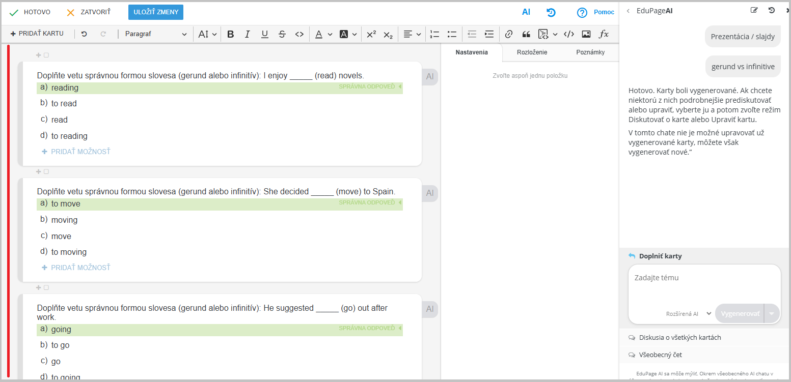 Môžete pridať ďalšie otázky. V AI v časti "Doplniť karty" napíšte, čo potrebujete pridať.