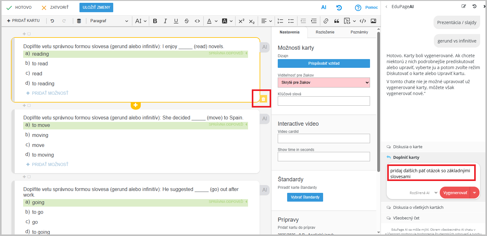 Otázky, ktoré nechcete použiť, môžete zmazať kliknutím na ikonu koša pri karte.