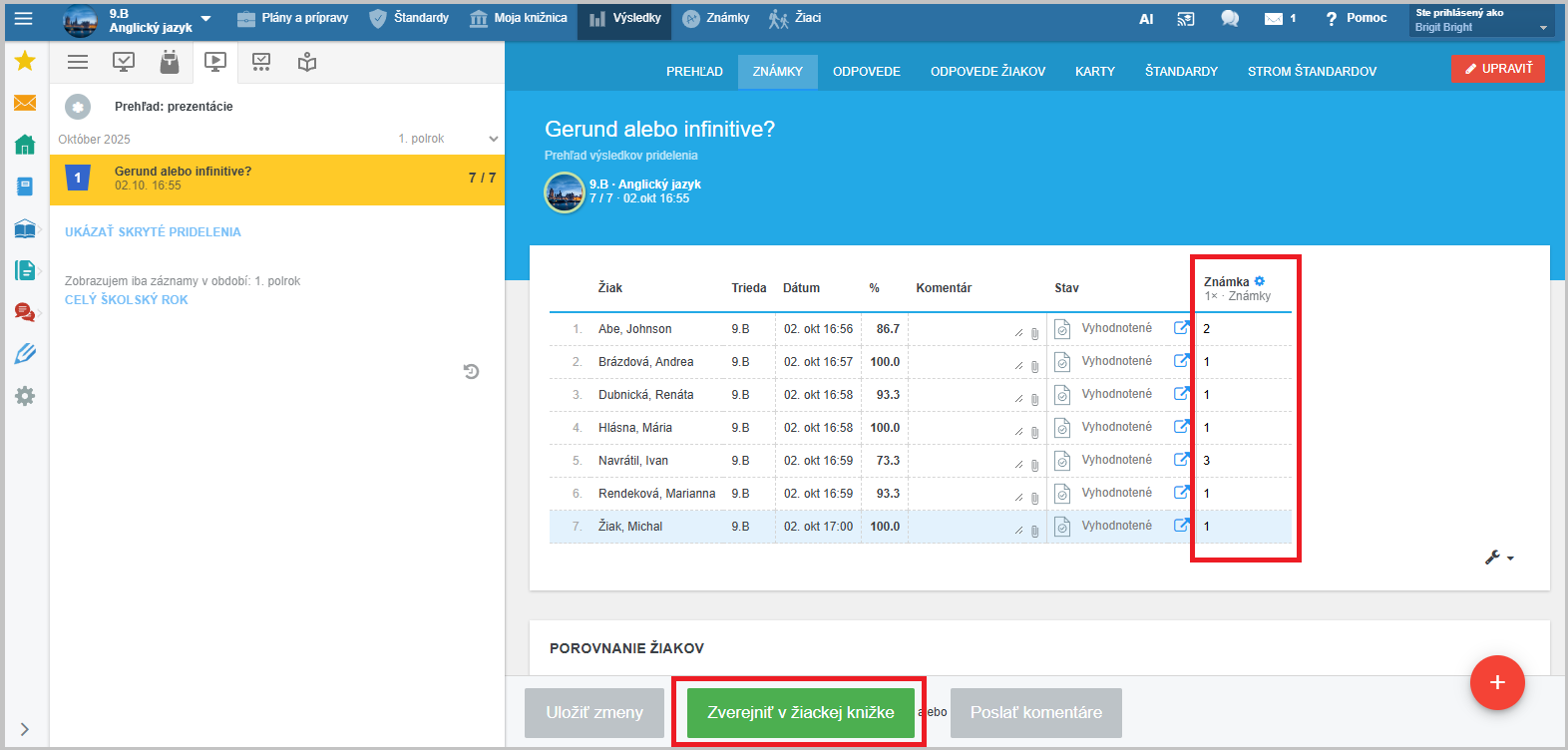 V časti "Známky" môžete zverejniť žiakom hodnotenie v žiackej knižke.