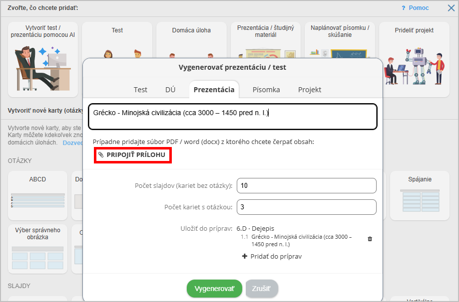 Ako pri vytváraní materiálu pomocou AI dám zdroj (napr. učebnicu), z ktorej sa má generovať prezentácia/test?