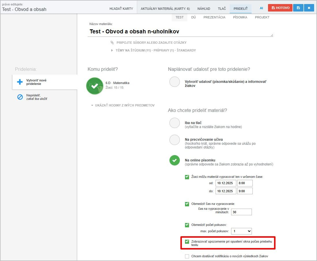 Učitel môže pri prideľovaní testu nastaviť, že žiaci nemôžu opúštať test: