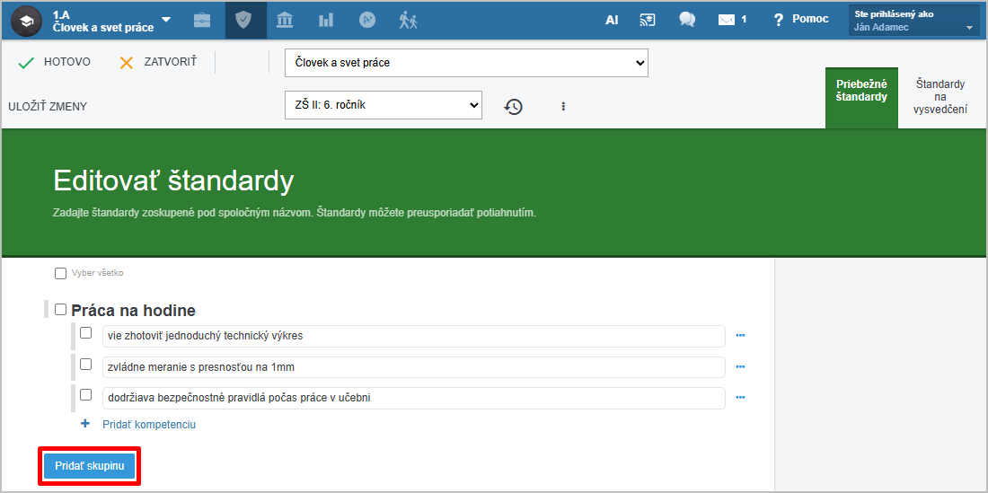 Zadajte názov skupiny a jednotlivé štandardy. Nový štandard pridáte tlačidlom Pridať kompetenciu.