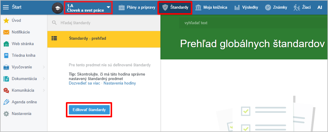 Zadané štandardy k predmetu sú viditeľné pre všetkých učiteľov daného predmetu na vašej škole. Tj. môžete si zadefinovať vlastné školské štandardy napríklad po dohode na predmetovej komisii.