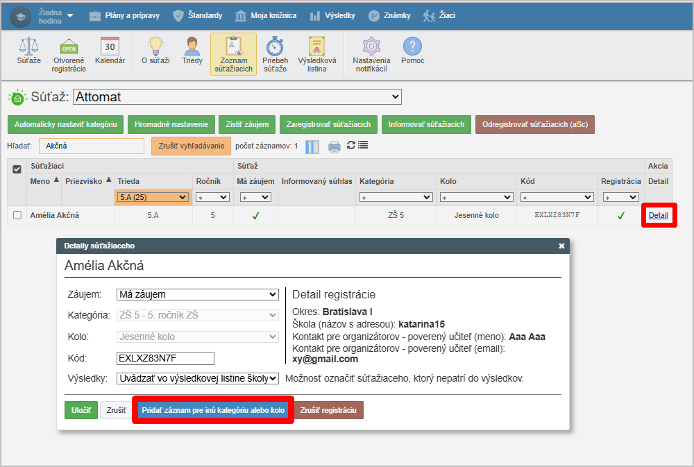 Žiačka Amélia Akčná je už zaregistrovaná v súťaži ATTOMAT v kategórii ZŠ 5 v jesennom kole a chce súťažiť aj v jarnom kole. Nakoľko je táto súťaž nepostupová, nie je možné ju zaregistrovať z výsledkovej listiny predchádzajúceho kola.