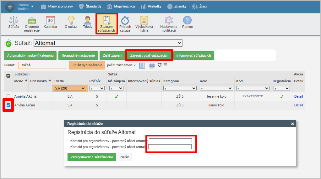Zaškrtnite ho a kliknite na Zaregistrovať súťažiacich a vyplňte potrebné údaje.