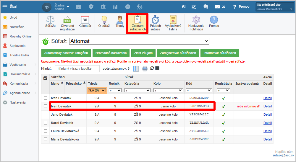 Žiakovi sa automaticky v "Zozname súťažiacich vytvorí registrácia na ďalšie kolo: