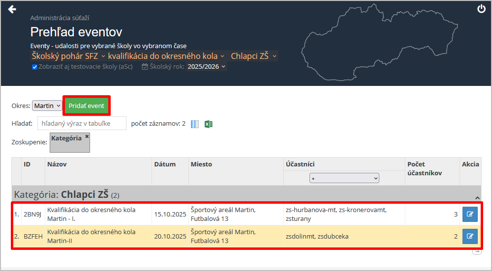 V prehľade eventov je zozanm všetkých vytvorených udalostí/ eventov v danom okrese a kategórii.