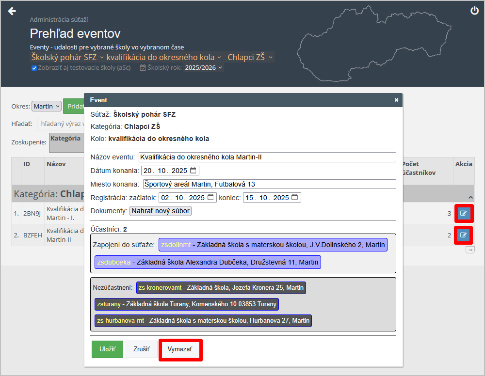 Pri chybne zadaných vlastnostiach udalosti ich viete upraviť (zmeny ca v krátkom čase prejavia aj v EduPAge daných škôl, prípadne je možné event aj vymazať.