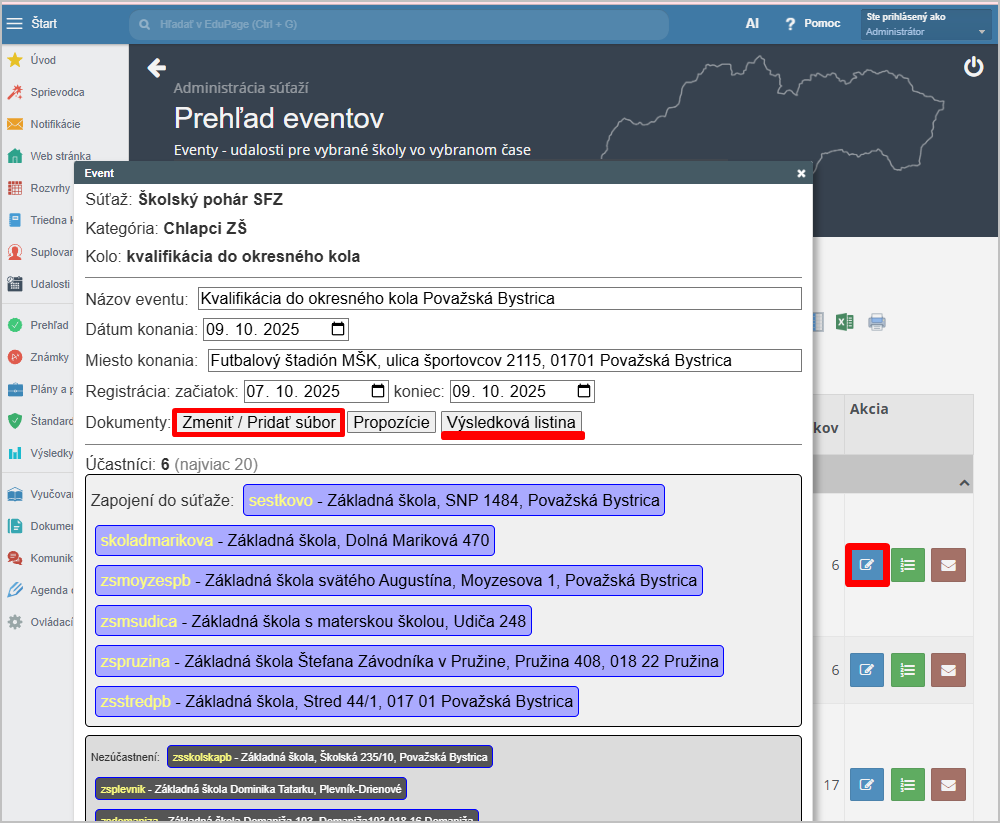 je potrebné vyselektovať súťaž (ak má organizátor právo na viac súťaží), konkrétne kolo (kvalifikácia do okresného kola, okresné kolo, kvalifikácia do krajského kola, krajské kolo) a kategóriu a do vami vytvoreného eventu viete cez modrú ikonu s perom (EDIT) pridať ďalší dokument - výsledkovú listinu.