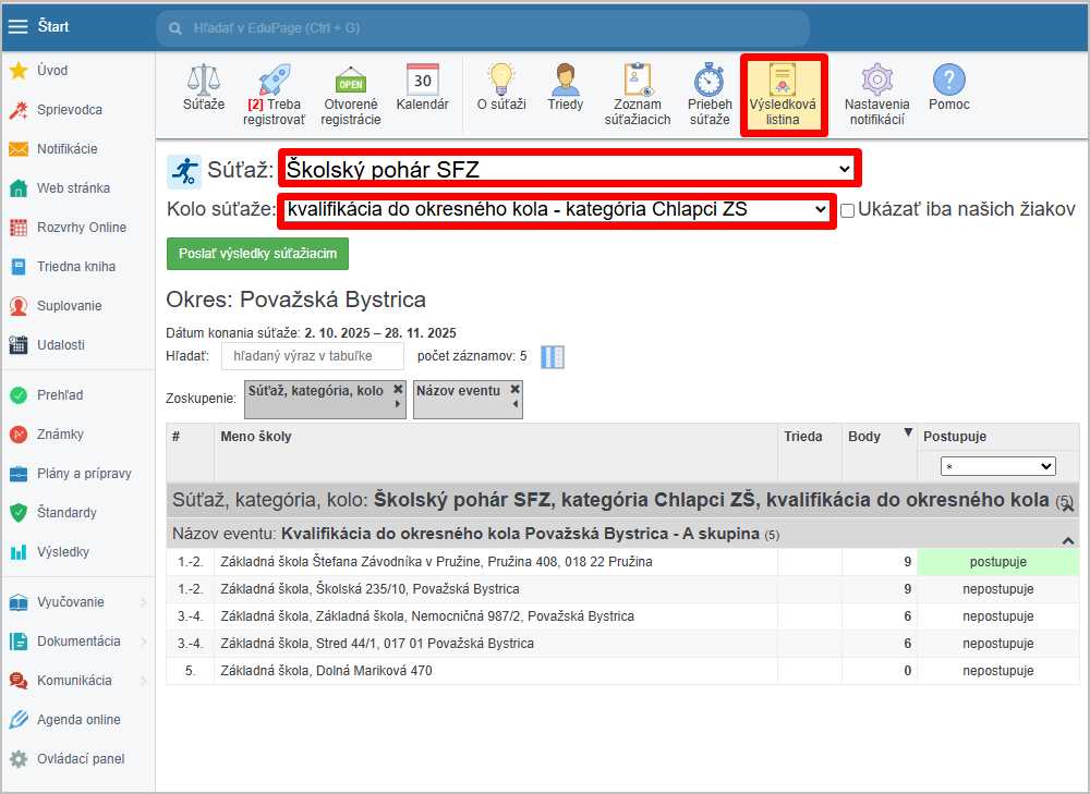 Po zadaní bodov a následnom vytvorení výsledkovej listiny ju zverejní orgnizátor individuálne pre každú súťaž/turnaj samostatne. Kým nie sú zadané výsledky a organoizátor VL nezverejní, nevidíte výsledky v školskom EduPage.