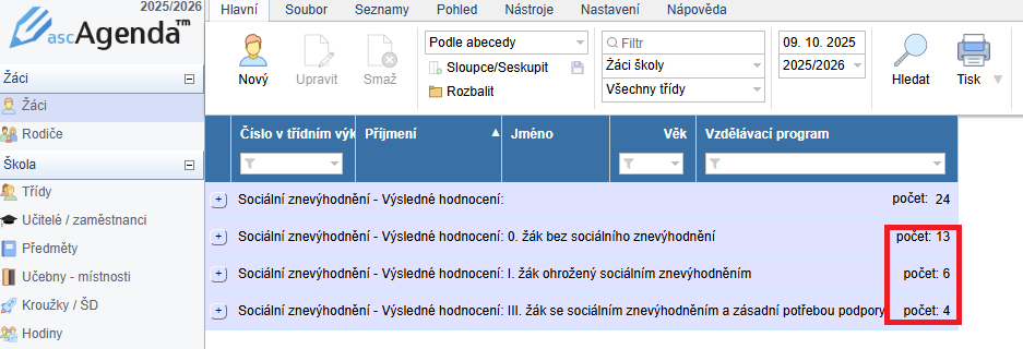 Sedemiestny kód definujúci hodnotenie žiaka môžete zadať v karte žiaka - položka "zdraví" - "sociální znevýhodnění":