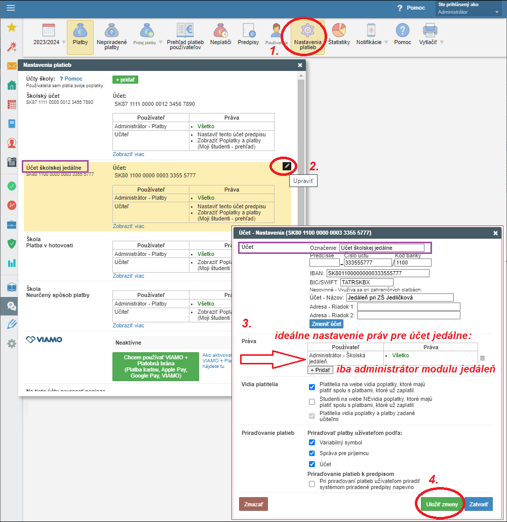 - vedúcej jedálne odoberte používateľské právo na administráciu modulu platby (nebude zbytočne vidieť iné školské účty)