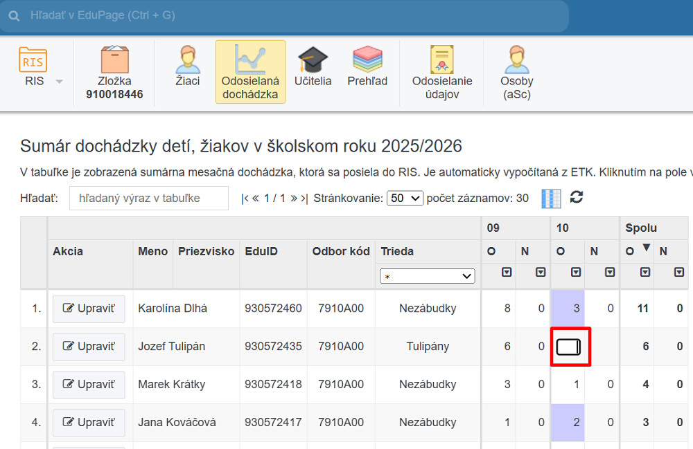 Ak škola nepoužíva elektronickú triednu knihu, údaje sa zadávajú manuálne priamo do Odosielanej dochádzky v module RIS.