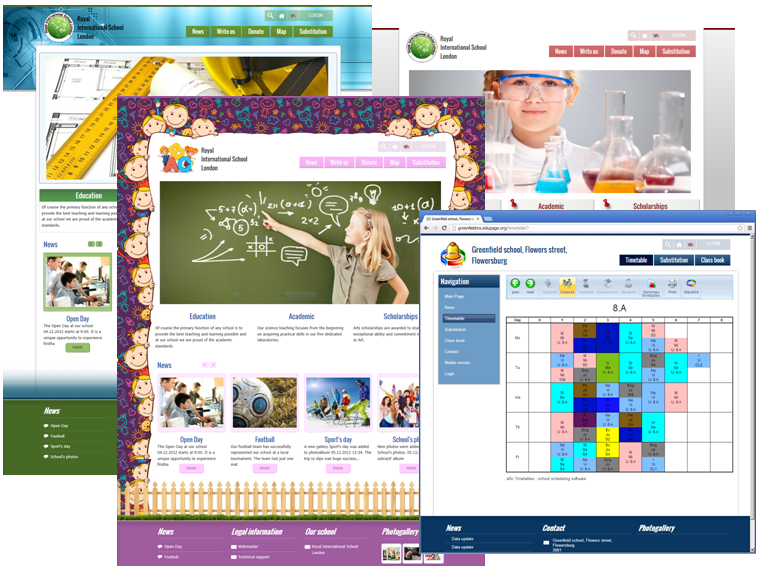 Nie iba na zverejnenie rozvrhu a suplovania, ale aj na zobrazovanie aktuálneho diania v škole, noviniek, článkov, fotografií … . Všetko zabalené v modernom dizajne, ktorý je možné plne prispôsobiť. Samozrejme možete využiť EduPage stránky iba publikovanie rozvrhu a suplovania a následne pridať odkaz na rozvrh a suplovanie na Vašu hlavnú webovú stránku školy.