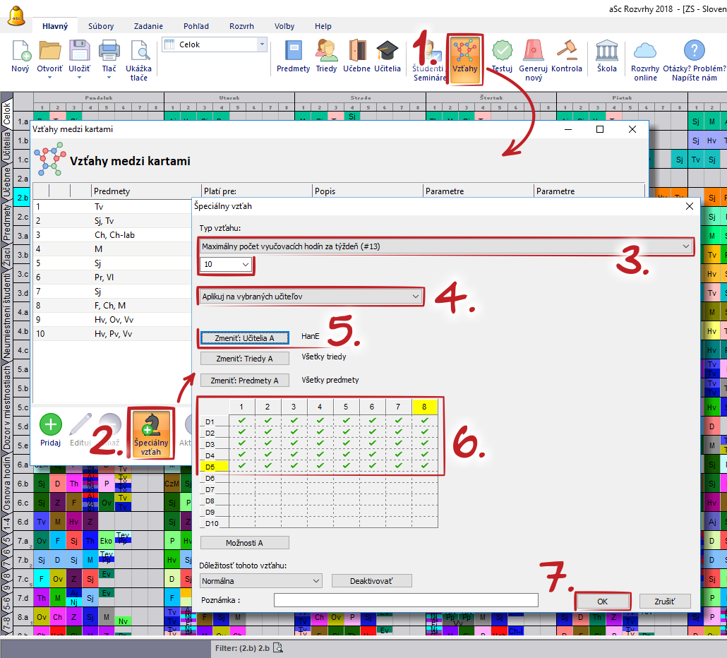 Aby ste tomu zabránili, musíte zadefinovať špeciálny vzťah medzi kartami, ktorý určí maximálny počet hodín, ktoré môže učiteľ odučiť počas prvých piatich dní (prvý týždeň):
