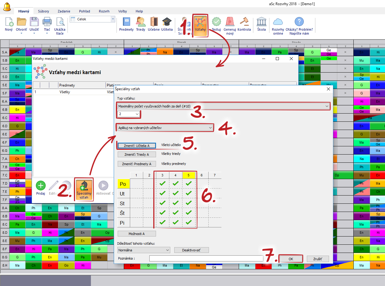 Príklad: Obed počas 3.-5. hodiny. Toto znamená, že sú 3 možné hodiny na obed. Takže prestávku na obed môžeme zabezpečiť tak, že počas 3.-5. hodiny bude mať učiteľ maximálne 2 hodiny za deň.