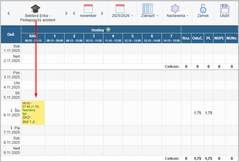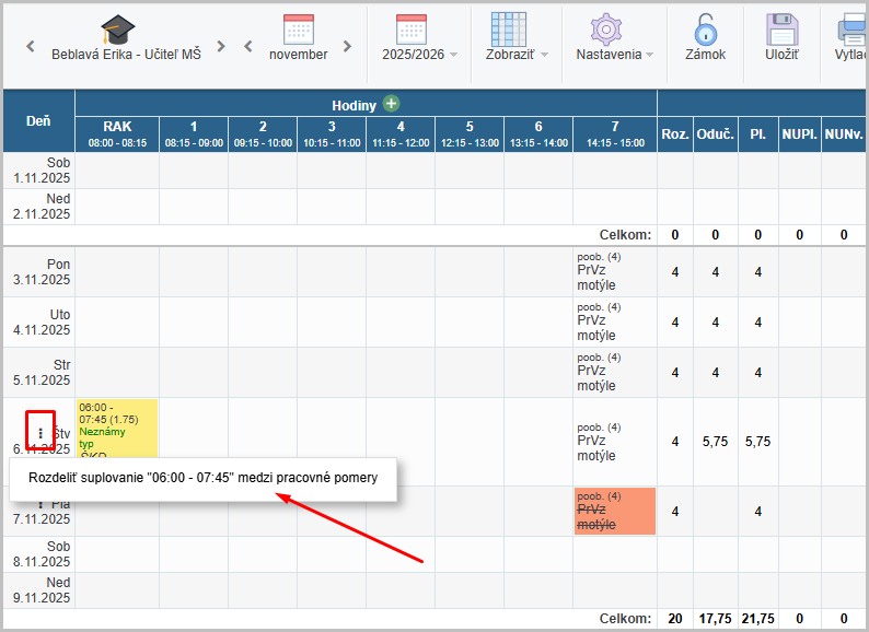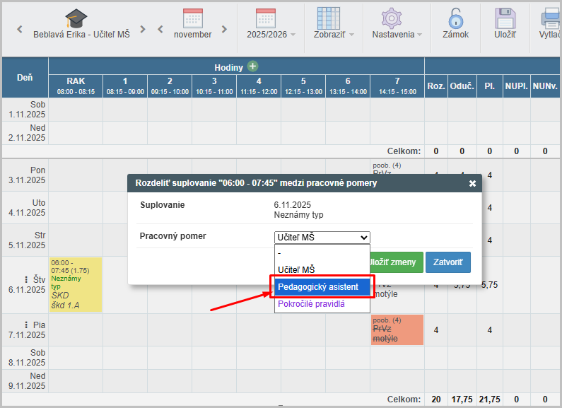 p. Beblavá suplovala 06.11.2025 rannú škd. Toto suplovanie patrí pod pracovný pomer Pedagog.asistentky. Je potrebné ho prerozdeliť: