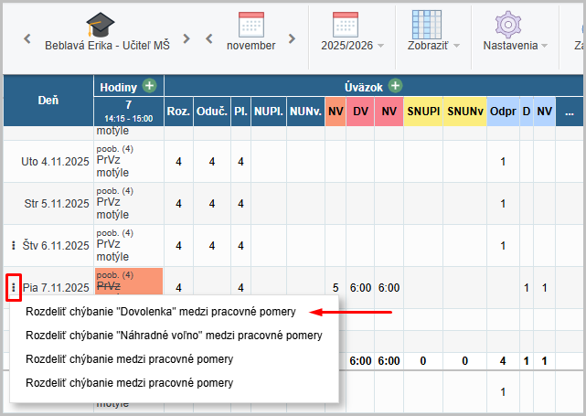 1. Klikom na tri bodky v daný deň vyberieme z ponuky "Rozdeliť suplovanie..."