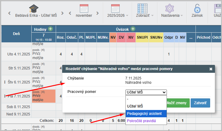 2. Zobrazí sa tabuľka, z ktorej pri pracovnom pomere vyberieme ten správny, ku ktorému dané chýbanie/neprítomnosť patrí. Zmeny uložíme.