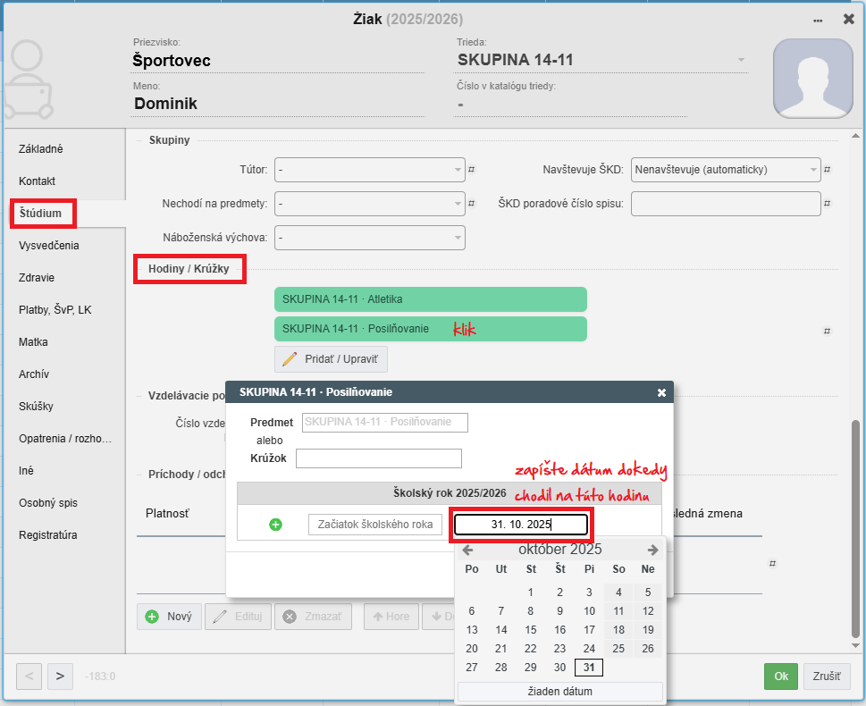 Športovec prestane figurovať v zozname žiakov od zadaného dátumu na danej hodine / tréningovej jednotke.