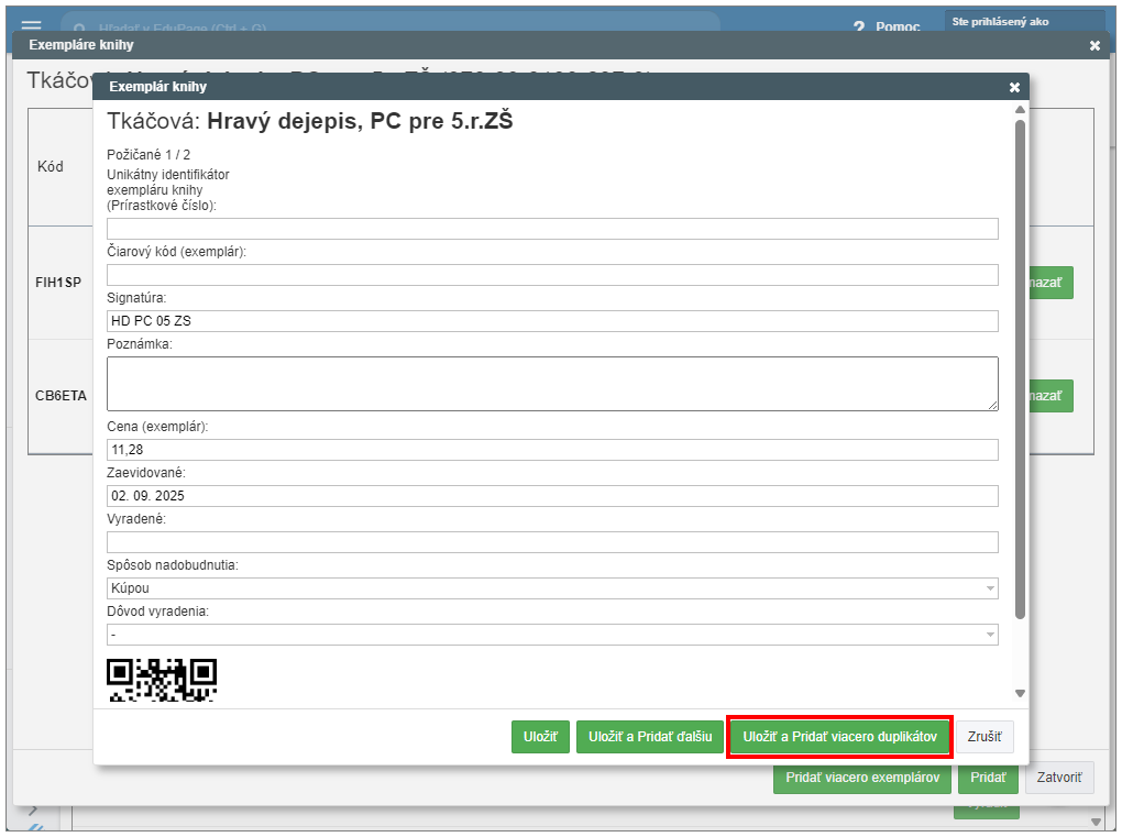 Ak si želáte vytvoriť viac exemplárov učebníc s rovnakými údajmi ako má už existujúci exemplár, potom v riadku vybraného exempláru stlačte tlačidlo "Pridať viacero duplikátov".
