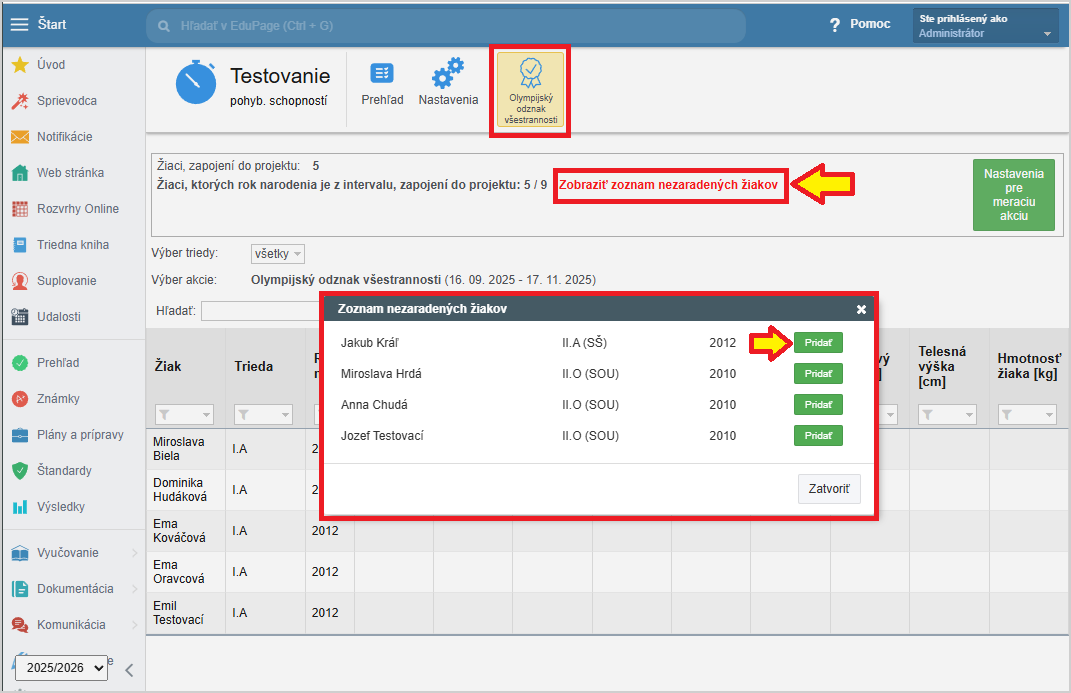 Následne už vaši poverení učitelia, ktorých ste určili, vedia priamo v EduPage v období 16. 09. 2025 - 17. 11. 2025 zapisovať merané hodnoty pre 6 disciplín Olympijského odznaku všestrannosti a telesnú výšku a hmotnosť žiaka: