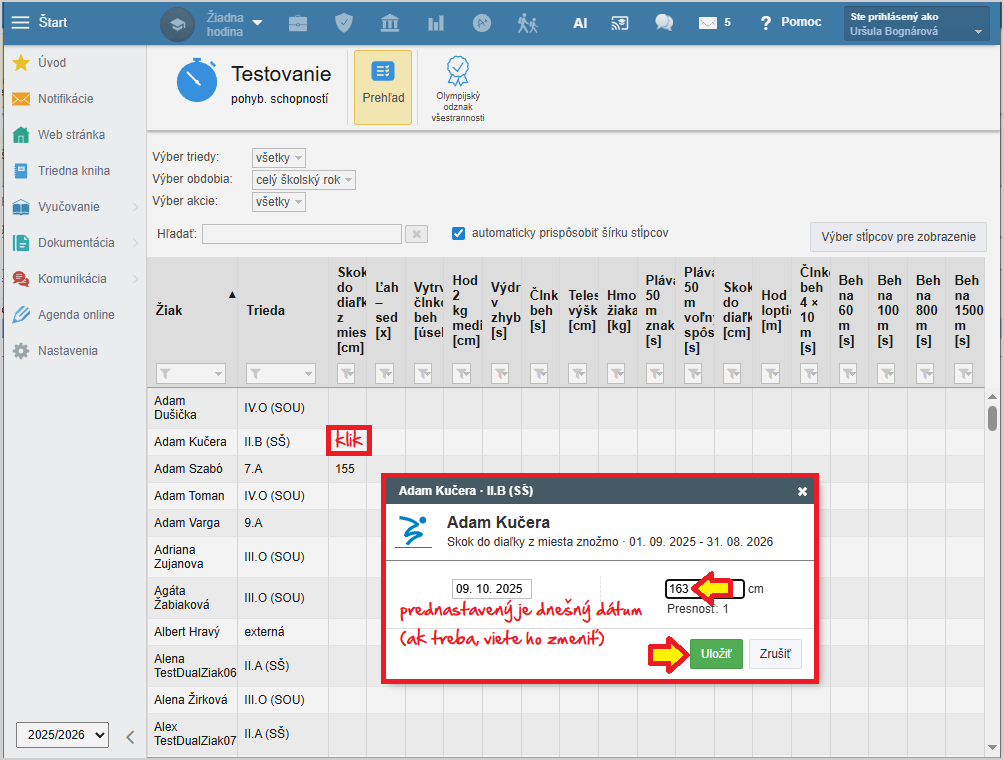 Nové meranie zapíšete tak, že v riadku žiaka kliknete na stĺpček s danou disciplínou.