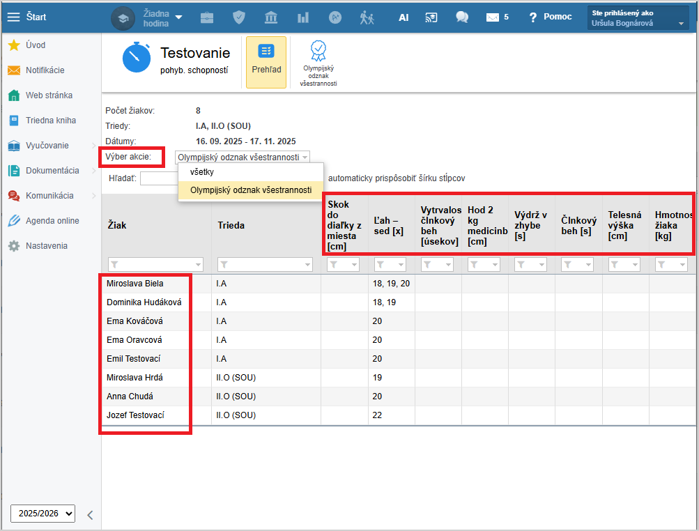 V záložke Prehľad vidíte zoznam všetkých žiakov školy a všetkých disciplín s meraniami, ktré ste už doteraz zapísali.