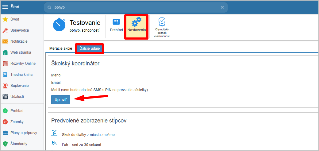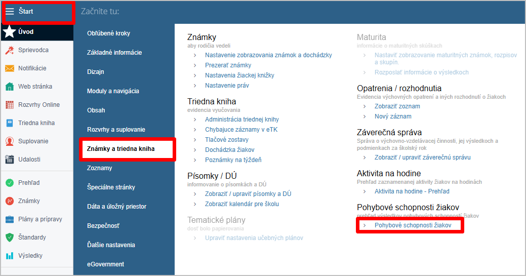 Prihláste sa ako administrátor. Cez Štart vyberte sekciu Známky a triedna kniha a tam zvoľte Pohybové schopnosti žiakov.
