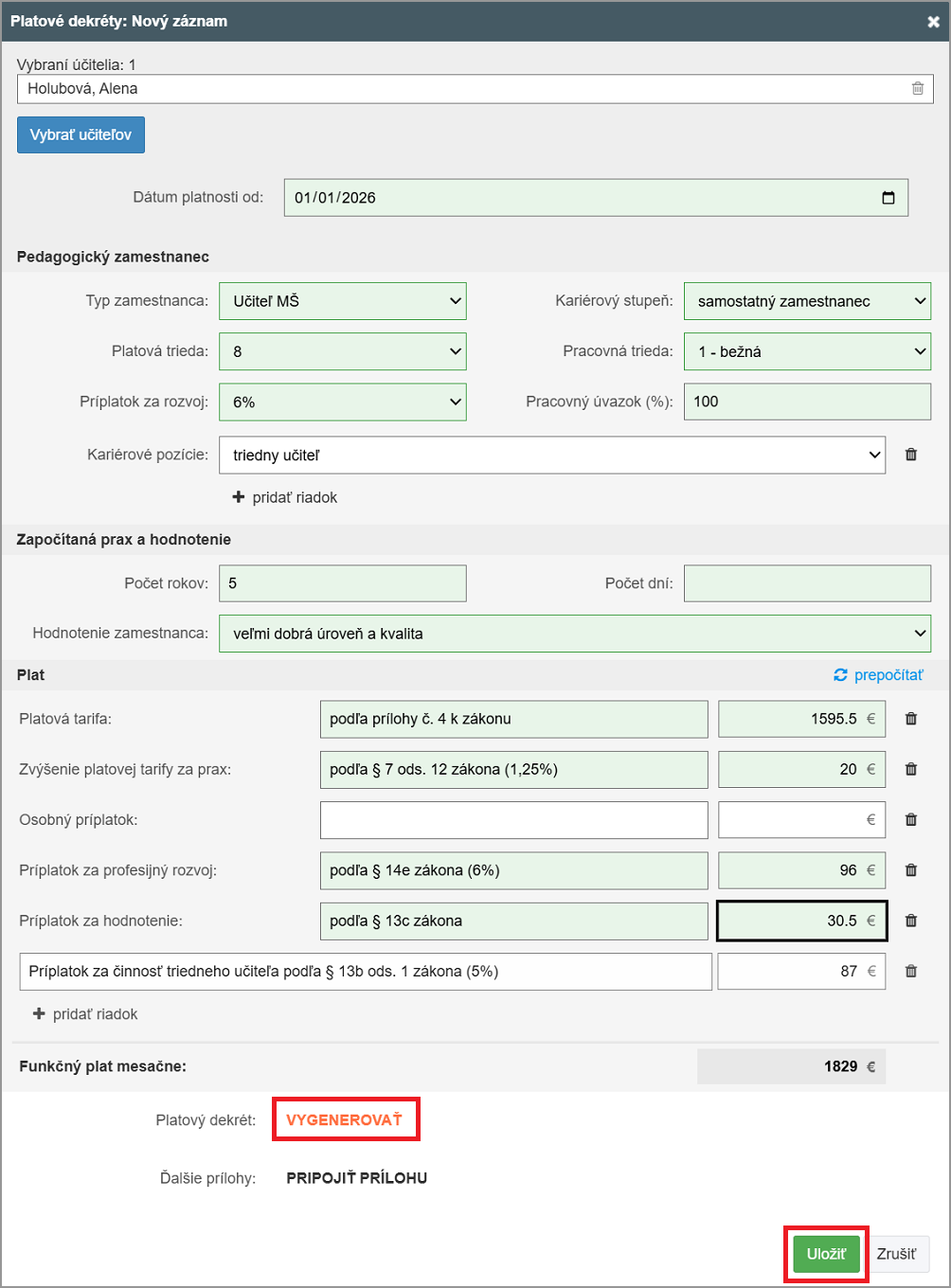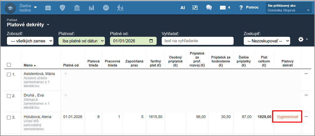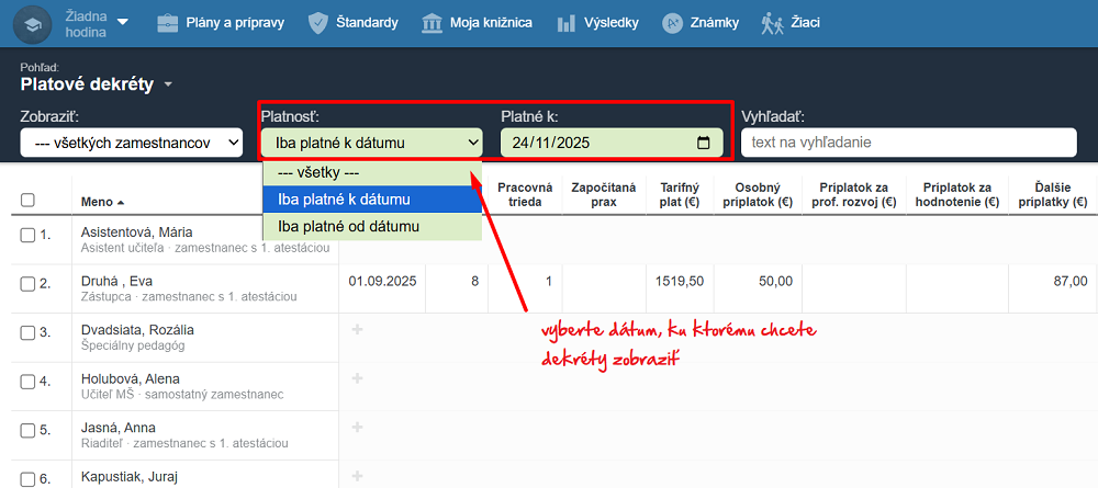 Ak zvolíte možnosť Uložiť, dekrét sa uloží a nájdete ho v prehľade platových dekrétov. Dôležité je správne zvoliť dátum, ku ktorému sa platový dekrét vzťahuje.