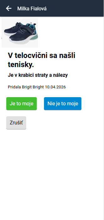 V texte správy bude informácia o konkrétnej nájdenej veci. Vyberte, komu chcete poslať notifikáciu. Rodičom a učiteľom je možné poslať notifikáciu až po 24 hodinách od posledného upozornenia, žiakom neobmedzene.