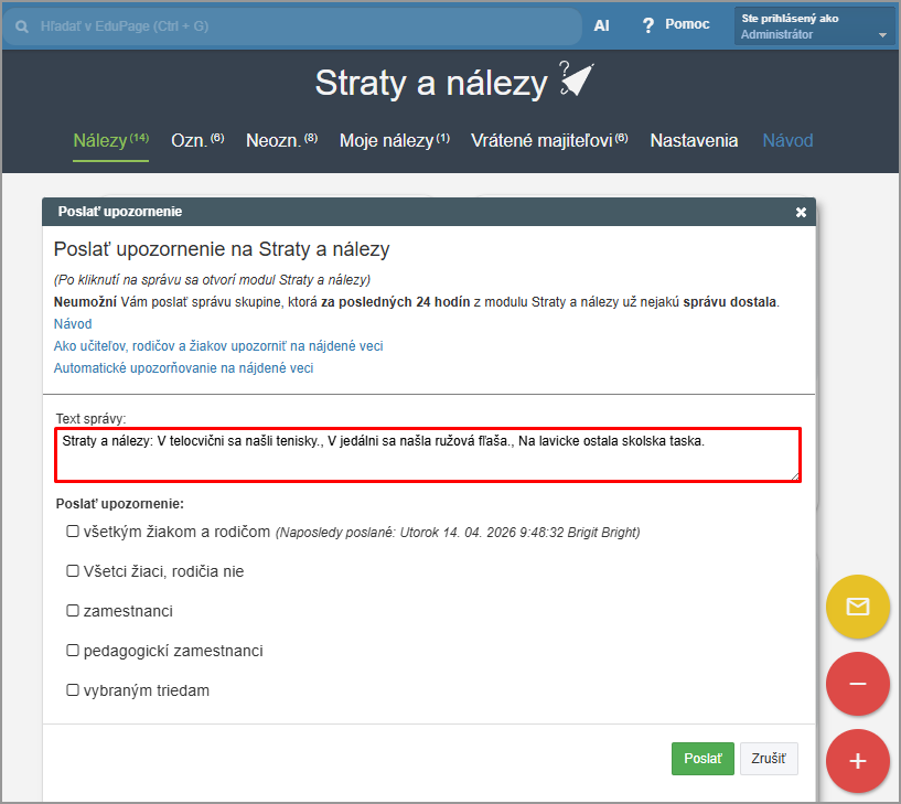 V texte správy sa Vám zobrazia informácie o nájdených veciach, ktoré ste označili. Vyberte skupinu adresátov, ktorým chcete poslať upozornenie. Rodičom a učiteľom je možné poslať notifikáciu raz za 24 hodín, žiakom aj viackrát denne.