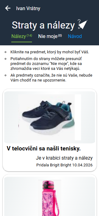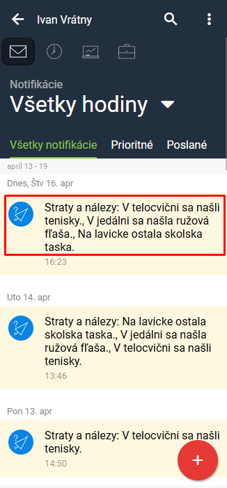 Vybraným adresátom príde notifikácia s textom, ktorý obsahuje informáciu o nájdených veciach. Po kliknutí na správu sa zobrazí modul Straty a nálezy.