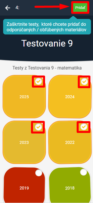 Podržte prst na teste/testoch, ktoré chcete dieťaťu odporučiť. Na týchto testoch sa zobrazí ikona srdiečka.