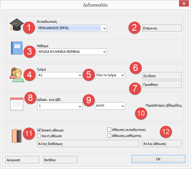 11. Αίθουσες: Εάν επιλέξετε την βασική Αίθουσα σημαίνει ότι η διδασκαλία μπορεί να γίνει στην βασική αίθουσα. Αντίστοιχα για την κοινή, την αίθουσα εκπαιδευτικού και την αίθουσα μαθήματος. Διαθέσιμες αίθουσες, εμφανίζει όλες τις αίθουσες και επιλέγετε ποια θέλετε.