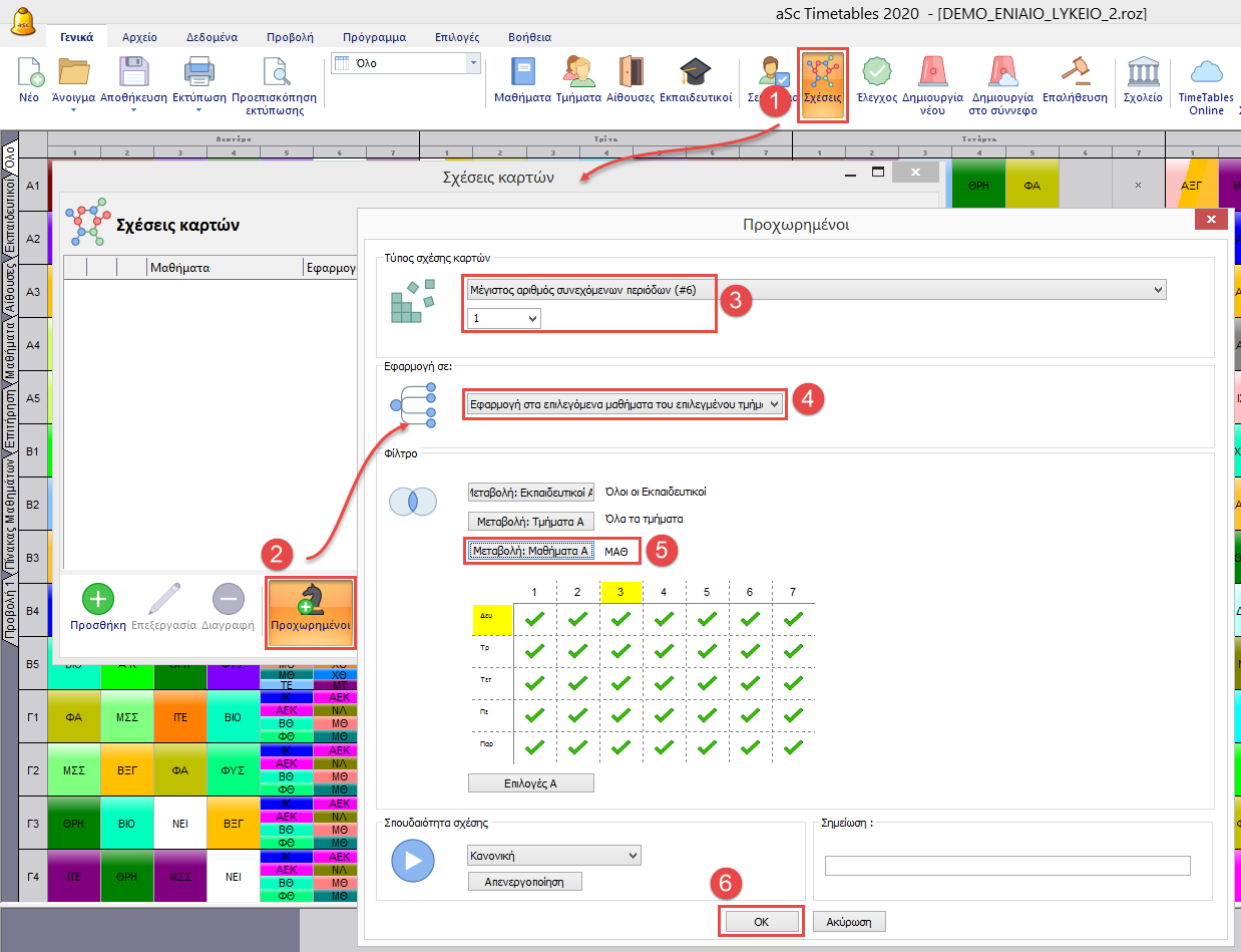 Εάν έχετε 6 διδασκαλίες Μαθηματικών κάθε μέρα της πενταήμερης εβδομάδας. Τότε θα υπάρχουν δύο περίοδοι Μαθηματικών κάποια μέρα. Αν δεν θέλετε να είναι συνεχόμενες, ορίστε την παρακάτω σχέση.
