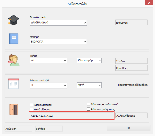Ας πούμε ότι το τμήμα Α1 έχει Βιολογία 3 φορές την εβδομάδα. Η διδασκαλία της Βιολογίας μπορεί να είναι στις αίθουσες Α101, Α102, Α103 και το πρόγραμμα μπορεί να επιλέξει μόνο μία, αλλά πρέπει να είναι η ίδια και για τις 3 διδασκαλίες.