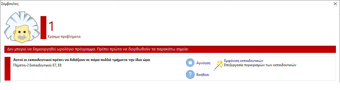 Για να λυθεί το πρόβλημα πρέπει να ανοίξουμε τις περιόδους στην μαρκαρισμένη θέση όλων των εκπαιδευτικών που αναφέρει ο Σύμβουλος. Φυσικά σε ένα πραγματικό πρόγραμμα αυτό είναι πιο δύσκολο. Δεν είναι ανάγκη να είναι μόνο οι Περιορισμοί. Πρέπει να ελέγξετε και τις άλλες συνθήκες που έχετε ορίσει.
