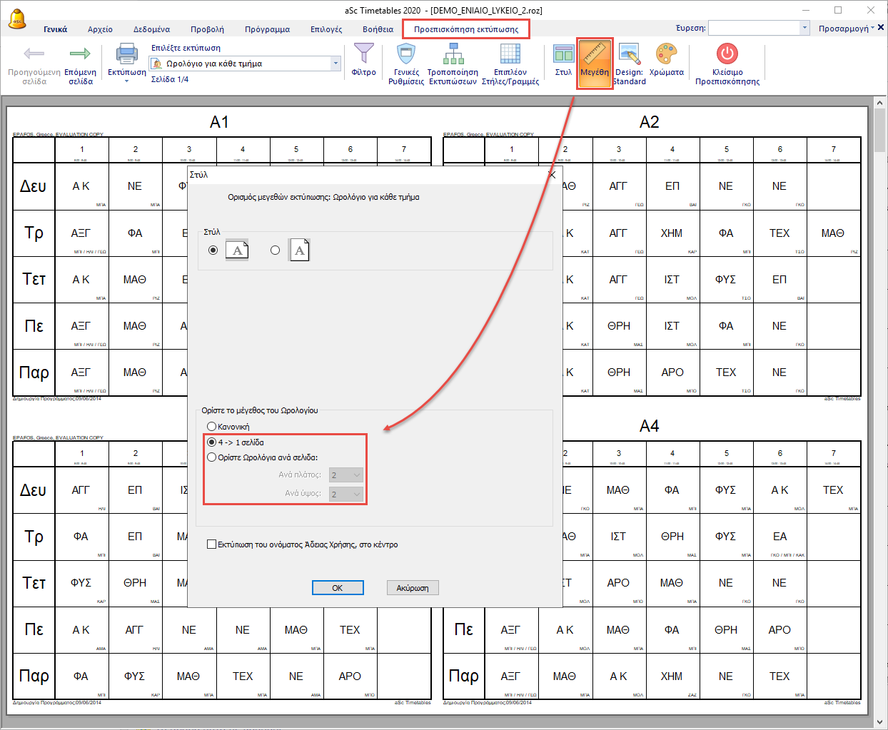 Κάντε κλικ στην επιλογή “Μεγέθη”. Εδώ μπορείτε να ορίσετε πόσα ωρολόγια θα εμφανίζονται σε κάθε σελίδα. Επιλέξτε ωρολόγια ανά πλάτος και ύψος ή επιλέξτε 4 ωρολόγια σε μία σελίδα 4 -> 1.