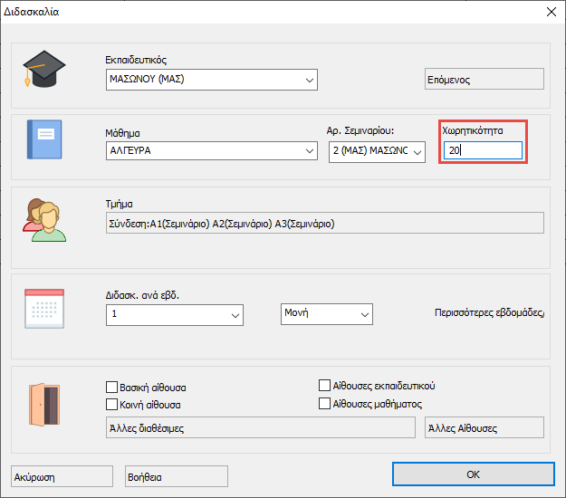 Σημείωση: Το πεδίο «Μέγιστος αριθμός μαθητών στην διδασκαλία», χρησιμοποιείται μόνο όπου το πεδίο «Χωρητικότητα» στην διδασκαλία έχει μείνει κενό. Εάν έχετε ορίσει «Χωρητικότητα» τότε η τιμή στο πεδίο «Μέγιστος αριθμός μαθητών στην διδασκαλία», θα αγνοηθεί από την εφαρμογή.