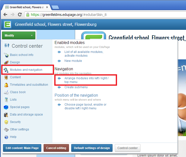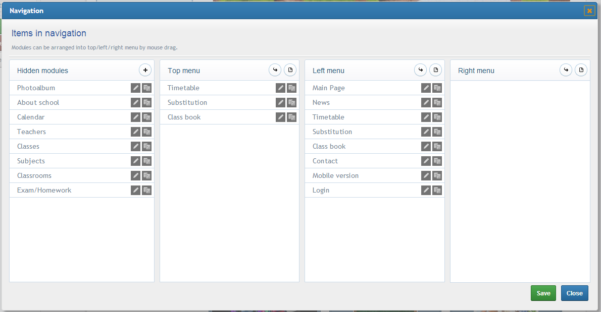 A dialog appears where you can simply move the items between menus. You can also create submenus and add your modules there, again by drag&drop.